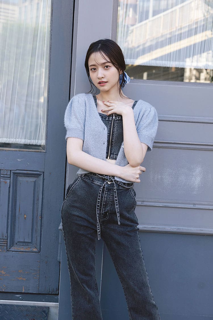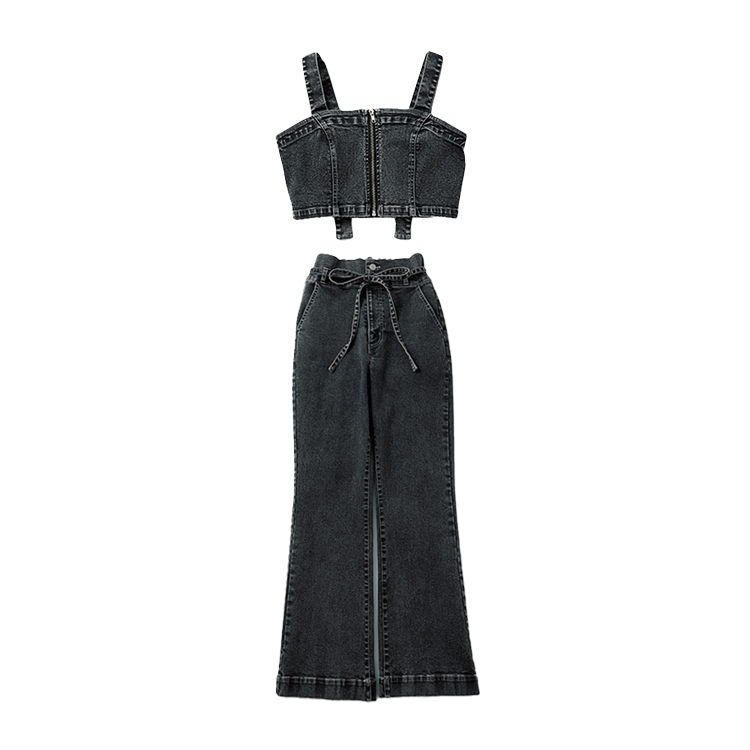 セットアップなら使い方無限大!定番デニムはコーデをグッと引き締める黒が気分。クセのないシンプルなビスチエはコーデになじみやすく使いやすい。