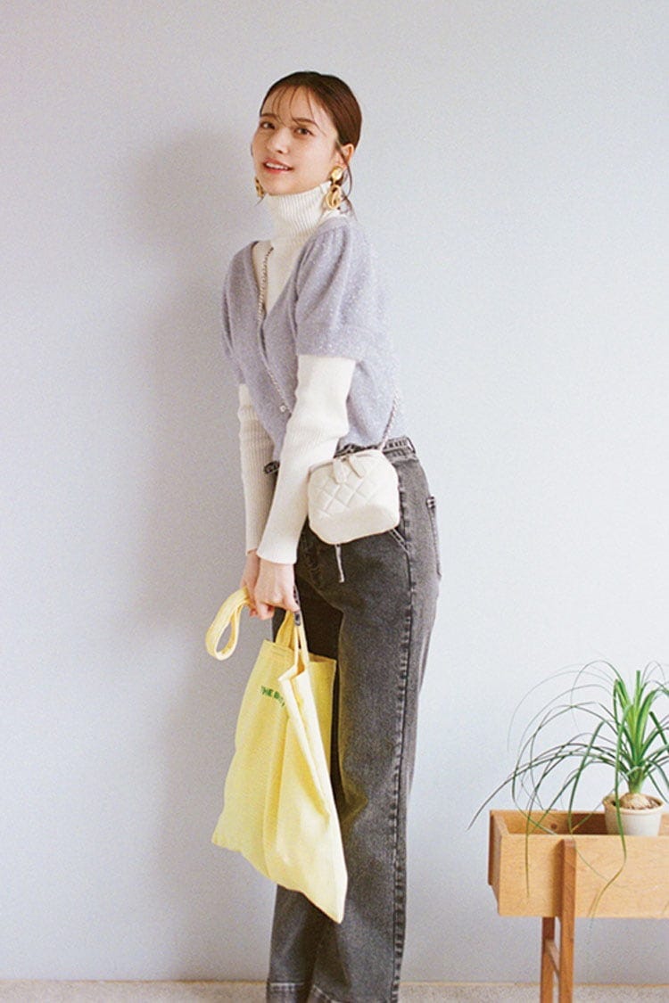 デニムパンツは着回し。白タートルニット 1,870円/レトロガール(R1000)2WAYラメカーディガン 5,390円/OLIVE des OLIVE イヤリング 4,070円/マチルダローズ ミニバッグ 2,990円、イエロートートバッグ 1,990円/ともに神戸レタス Coordinate3 こなれ印象なデニムセットアップコーデ