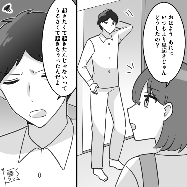 順調にお弁当を作っていると、いつもより早く夫が起きてきました。