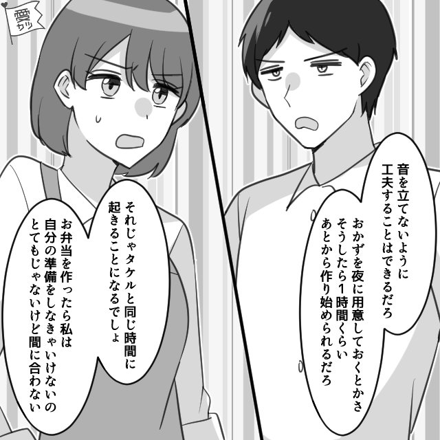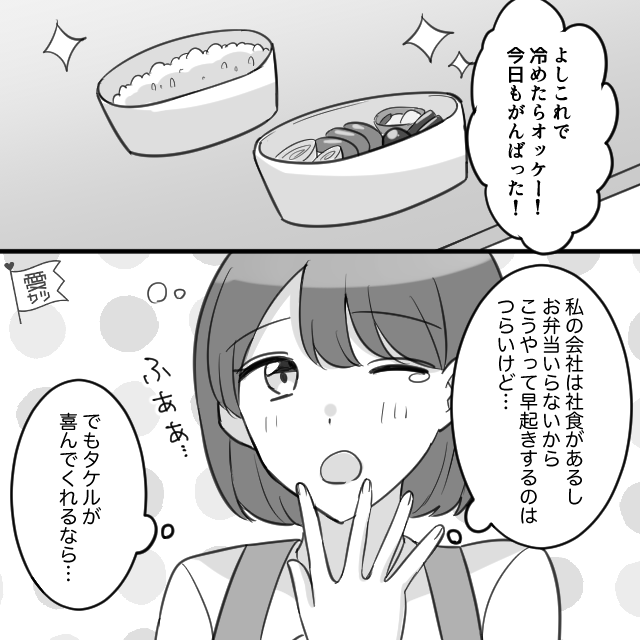 夫と共働きの主人公は、早起きして夫のお弁当作りをするのが日課に。
