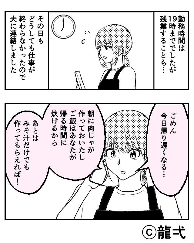 仕事の前に子どもの世話をしながら、夕飯の準備までしてきた主人公は、夫の一言に腹が立ち電話を切りました。