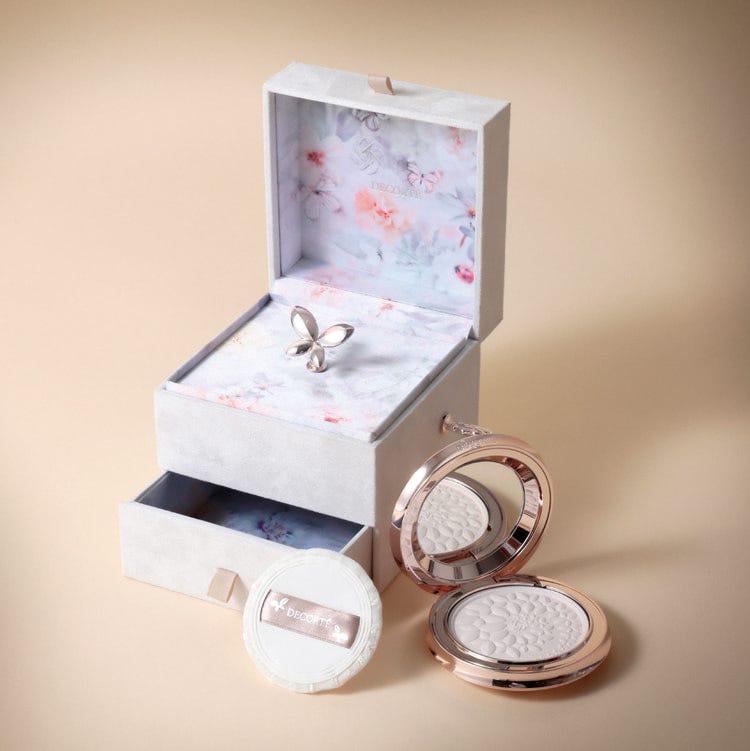 繊細な粉質が毛穴や凹凸をふんわりカバーし、ラベンダーベージュのパウダーが透明感をメイク。これを機にベースメイクを更新!