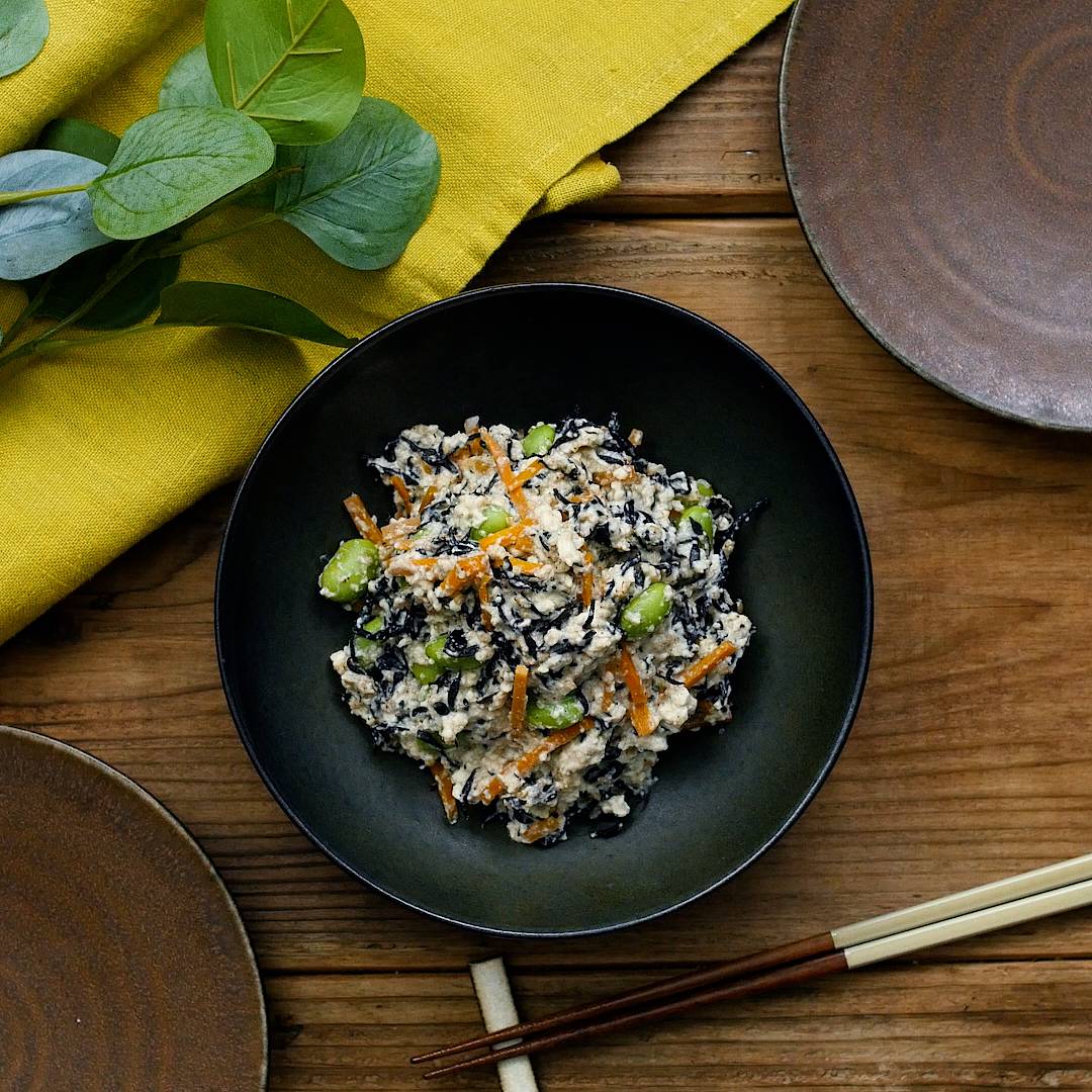 ・絹豆腐 … 150g・乾燥芽ひじき … 4g・にんじん … 30g・むき枝豆 … 20g・めんつゆ(3倍濃縮) … 小さじ2杯・a. 砂糖 … 小さじ2杯・a. しょうゆ … 小さじ1/2杯・a. 白すりごま … 大さじ2杯【下ごしらえ】ひじきの白和え