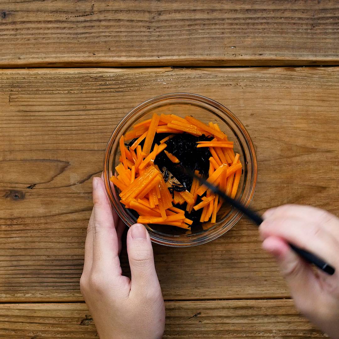 ボウルにひじき、にんじん、めんつゆを入れてさっと混ぜ合わせます。ラップをかけてレンジ600Wで1分30秒加熱します。