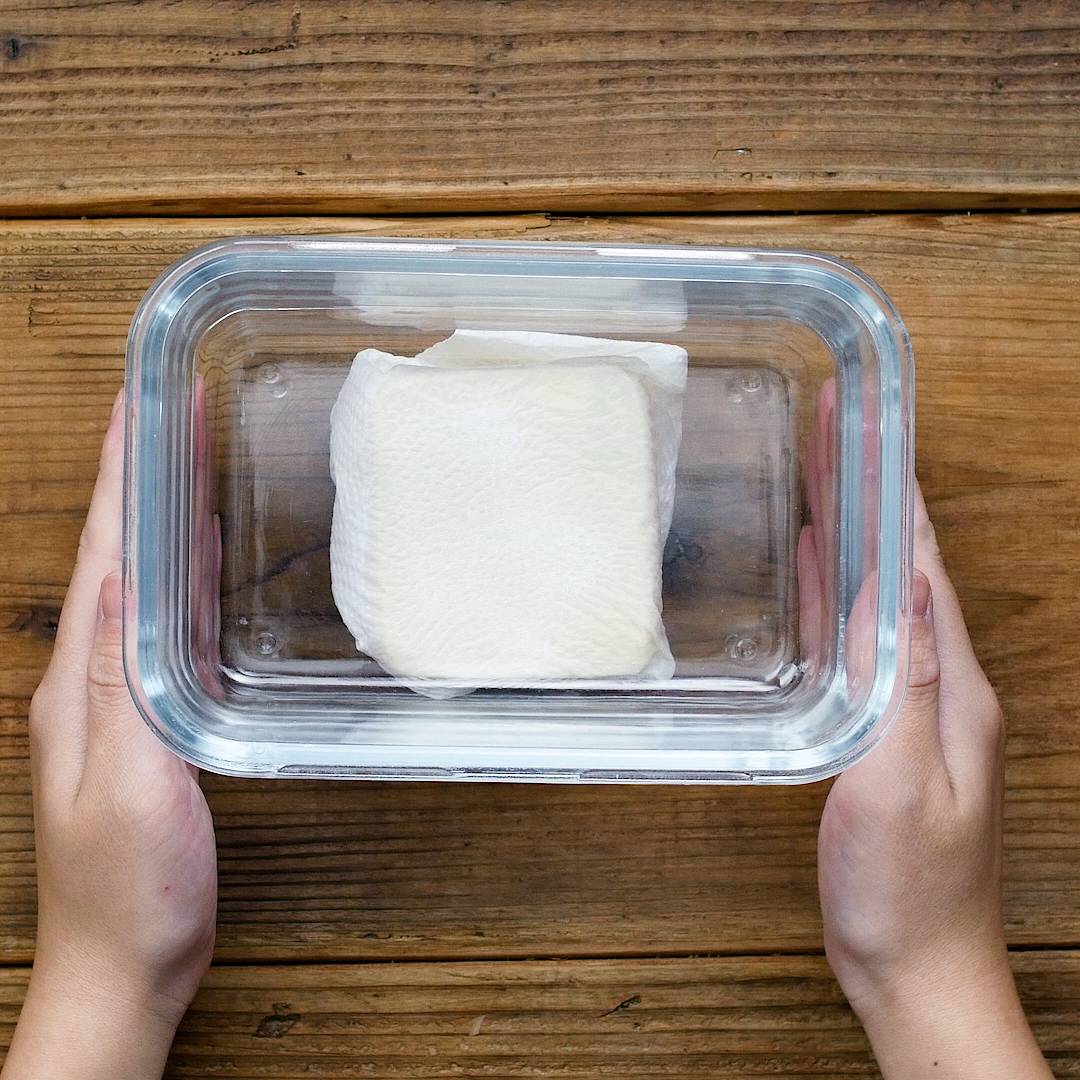 キッチンペーパーで豆腐を包み、耐熱容器に入れます。上から耐熱容器を重ね、レンジ600Wで2分加熱して粗熱を取ります。