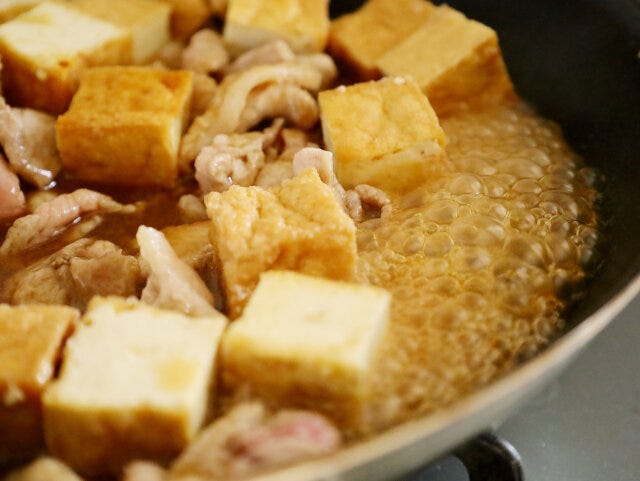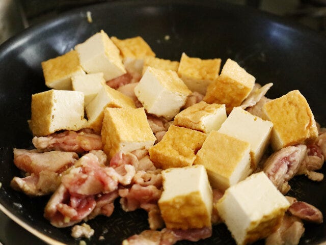 ③ 厚揚げも入れ、豚小間の脂を絡ませるように炒める。