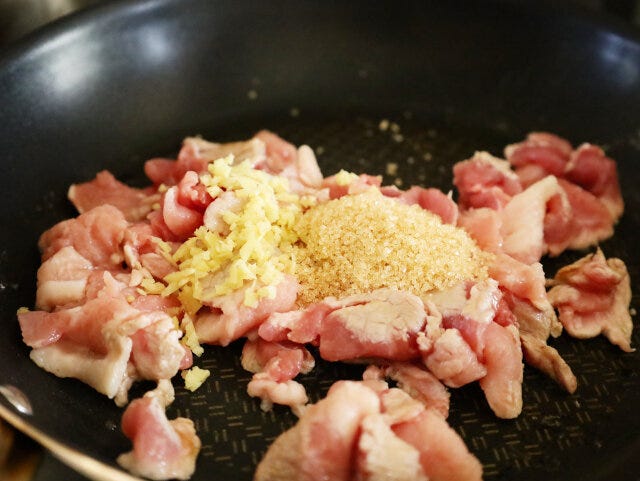 ② 半分ほど火が通ったら、千切りにしたしょうがと砂糖を加える。