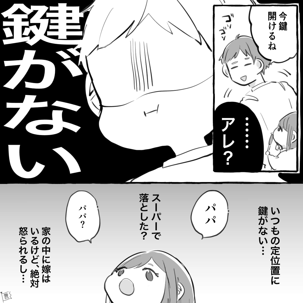 玄関前で鍵の紛失に気づき、血の気が引いた主人公のエピソードでした。