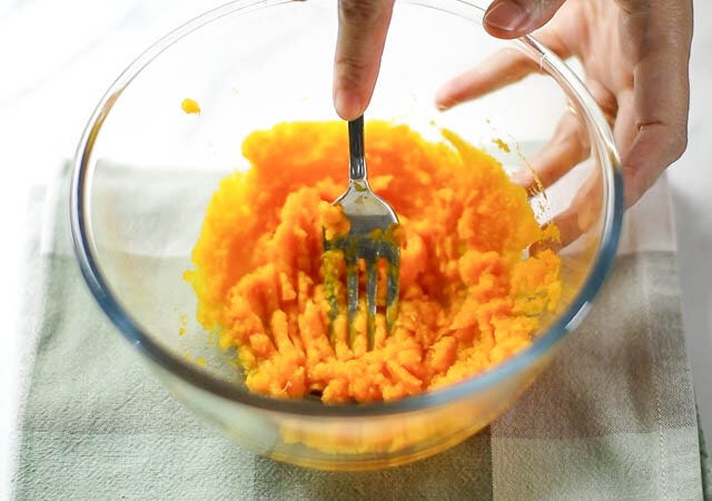 ① ボウルにかぼちゃを入れてフォークで潰してピュレ状にします。