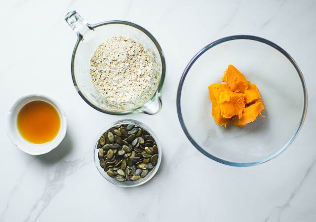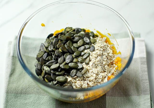② オートミール、パンプキンシード、メープルシロップを加えてひとまとまりになるまで混ぜます。