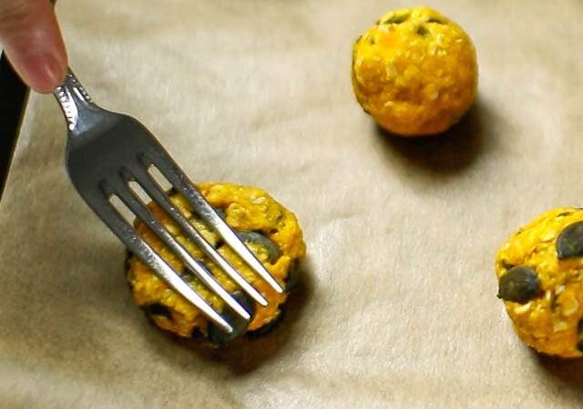 ④ フォークで押し潰してまるいクッキーのかたちに整えます。