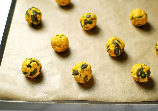 ③ 生地をひとつ20g程度のボール状に丸めて、オーブンシートを敷いた天板にひとつひとつを離して並べます。