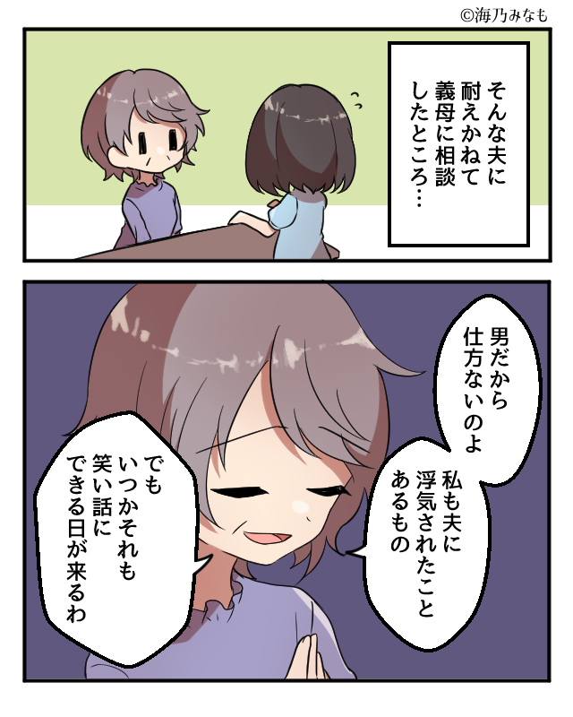 義母に夫の浮気癖を相談しても、我慢するものだとなだめられてしまった主人公。