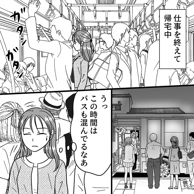 いつものように仕事を終え、混雑したバスに揺られて帰宅する主人公。