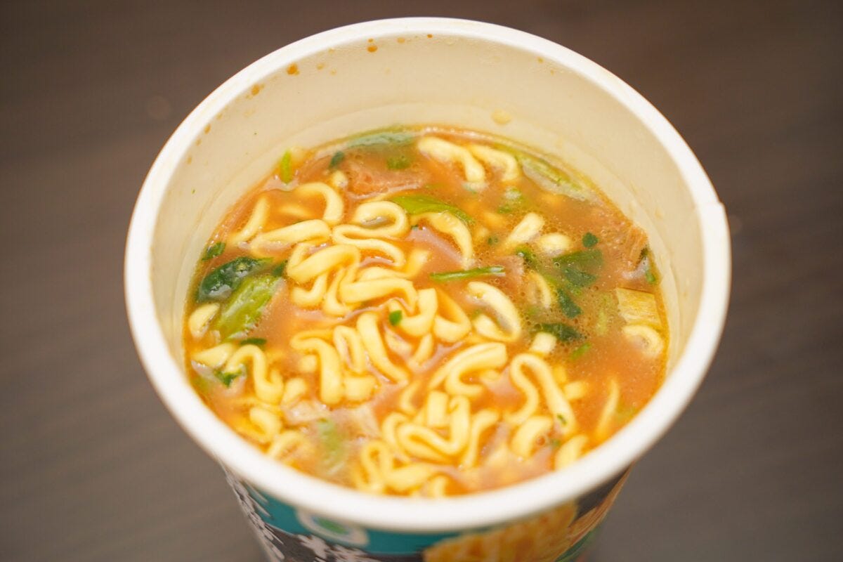 お湯を注ぎ完成したのがこちら。太麺であるため待ち時間が5分とやや長めであったが、空腹は最高のスパイスであるため問題ない。クリーミーな香りは家系っぽさを感じるが果たして味は...。