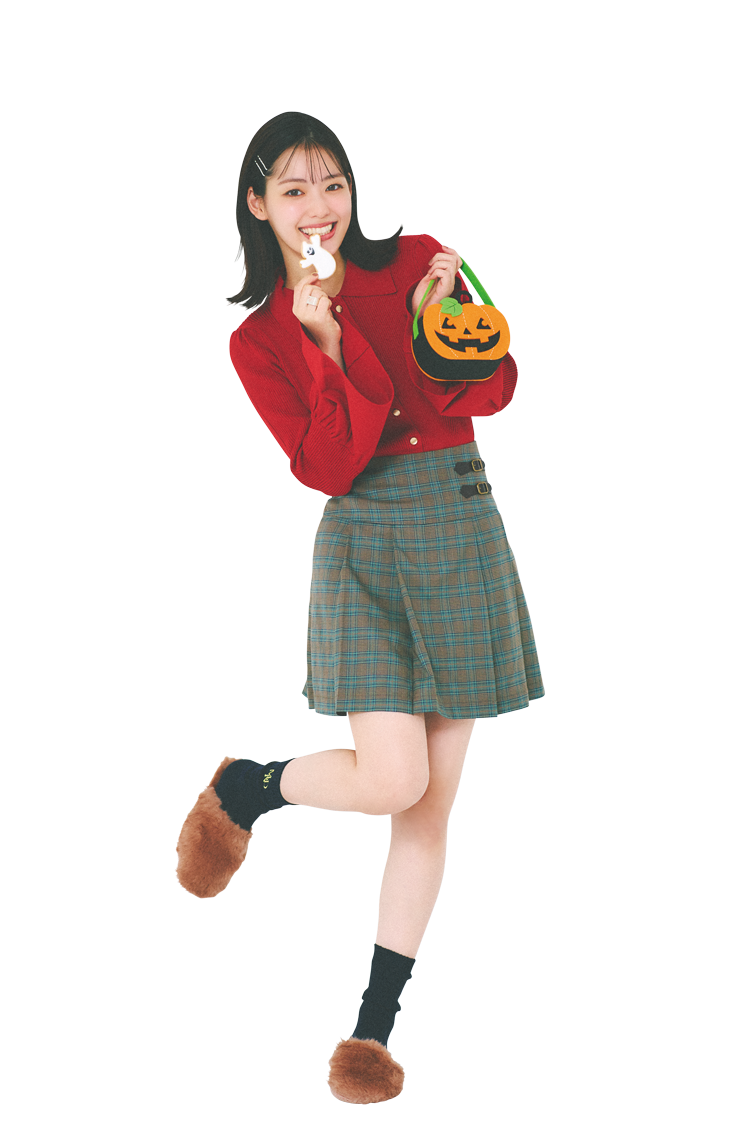 チェックスカートをあわせてレトロチックな仕上がりに。メリハリのあるシルエットでスタイルアップ効果も◎。