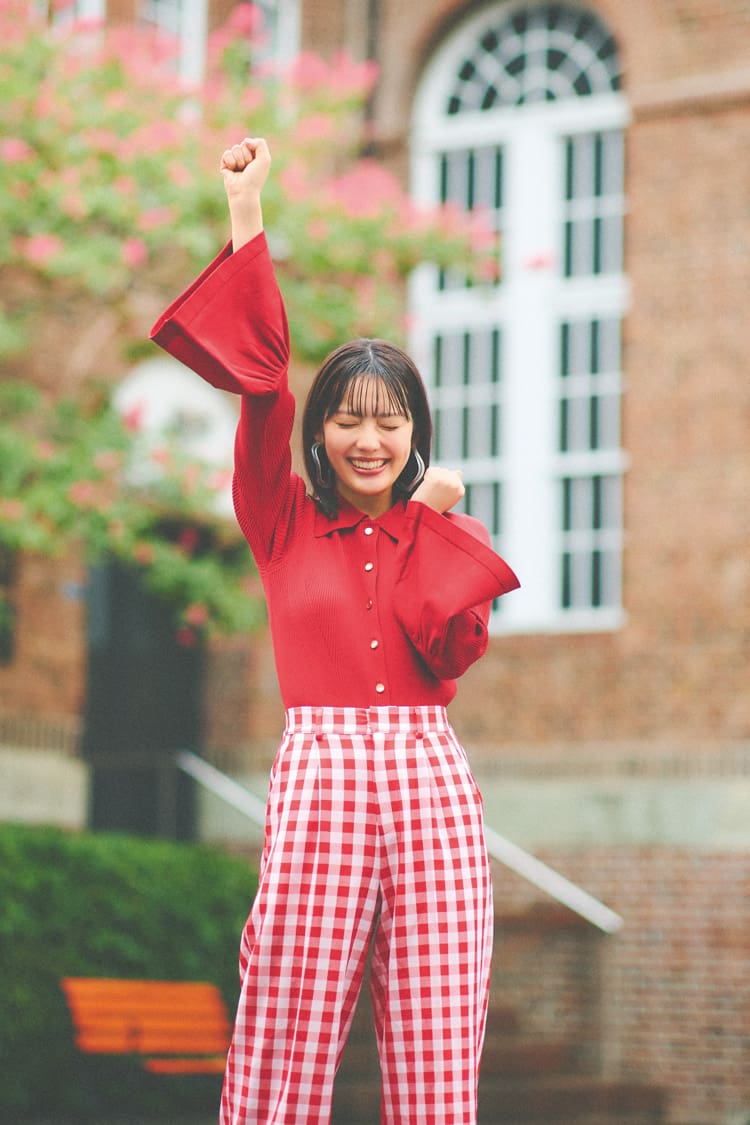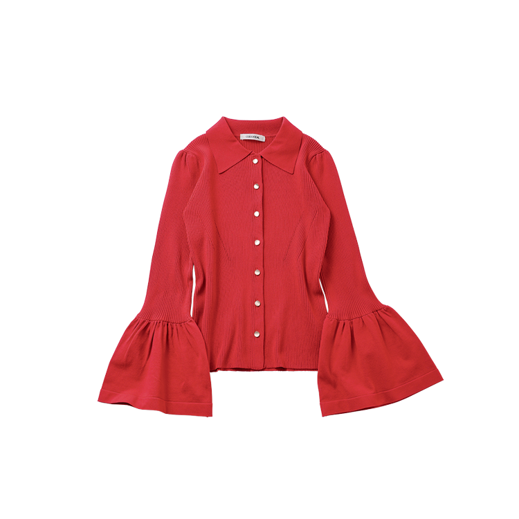 今季注目のリブトップスは撮影や配信にぴったりの赤色で映え意識。えりとゴールドのボタンが上品。そでが大きく広がるのできゃしゃに見せる効果も♡