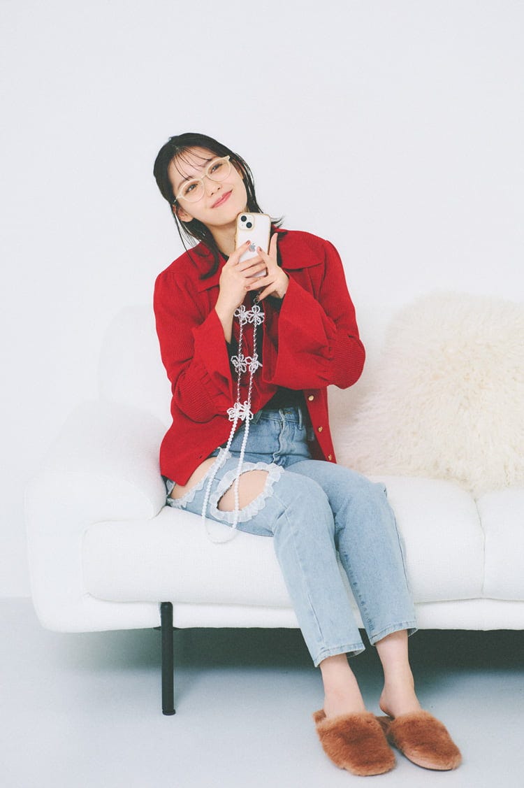 ニットシャツは着回し。シャーリングパフショルトップス 9,900円/RANDA カットアウトジーパン 5,940円/MORE self LOVE めがね 20,900円/ダブルラバーズ(スクリーンショット) 携帯ストラップ 3,850円/キャセリーニ ルームシューズ/スタイリスト私物 Coordinate4 カラーを統一してしゃれ見えコーデ
