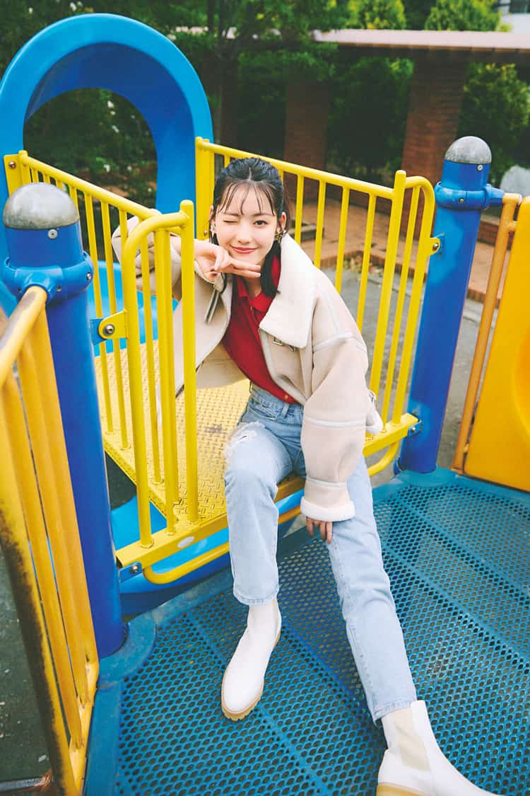ニットシャツは着回し。ボアショートブルゾン 15,400円/dazzlin カットアウトジーパン 5,940円/MORE self LOVE イヤリング 6,300円/アビステ 白サイドゴアブーツ 27,500円/ダイアナ(ダイアナ 銀座本店) Coordinate3 羽織ってアットホームな楽ちんコーデ