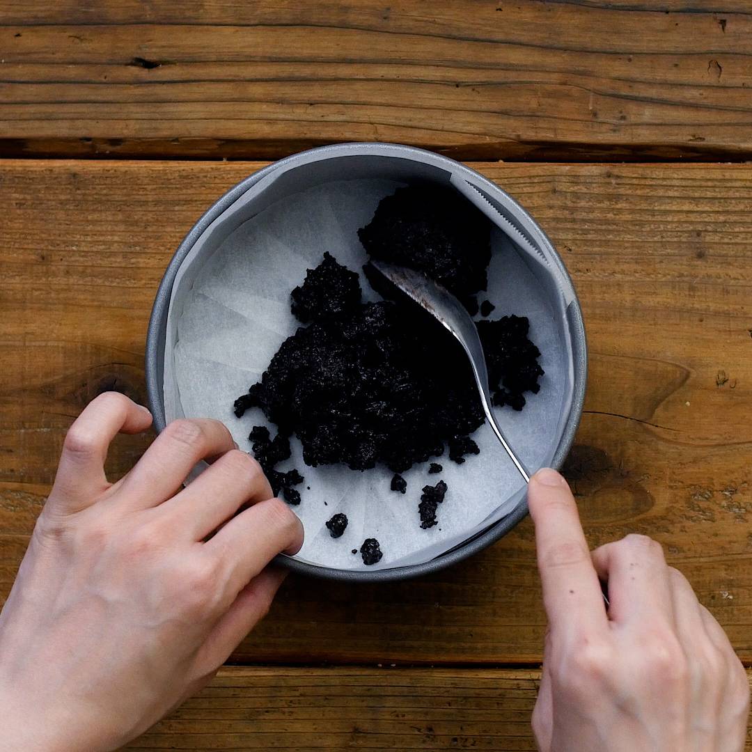 溶かしバターを入れてなじませたら型に入れてスプーンでならし、冷蔵庫で冷やします。