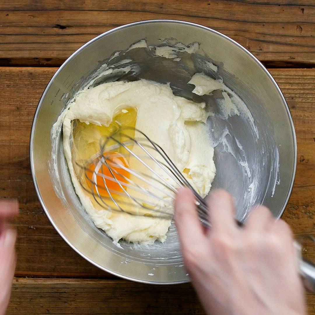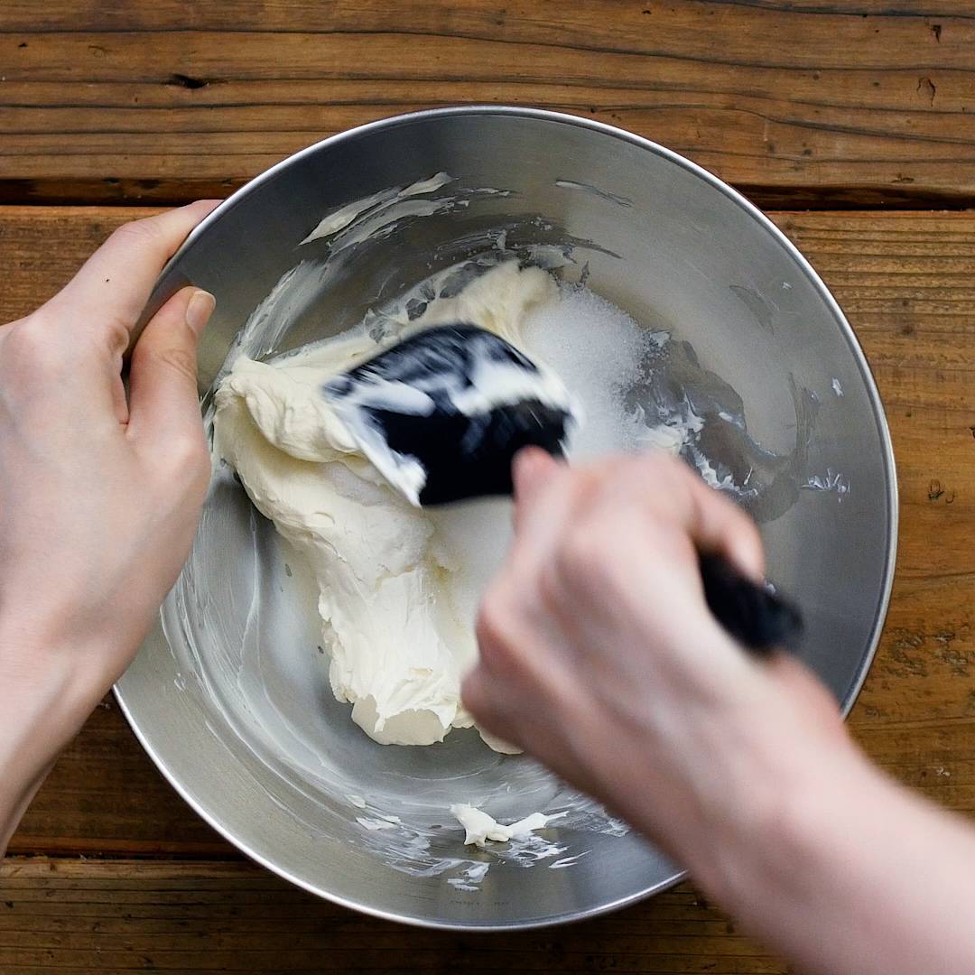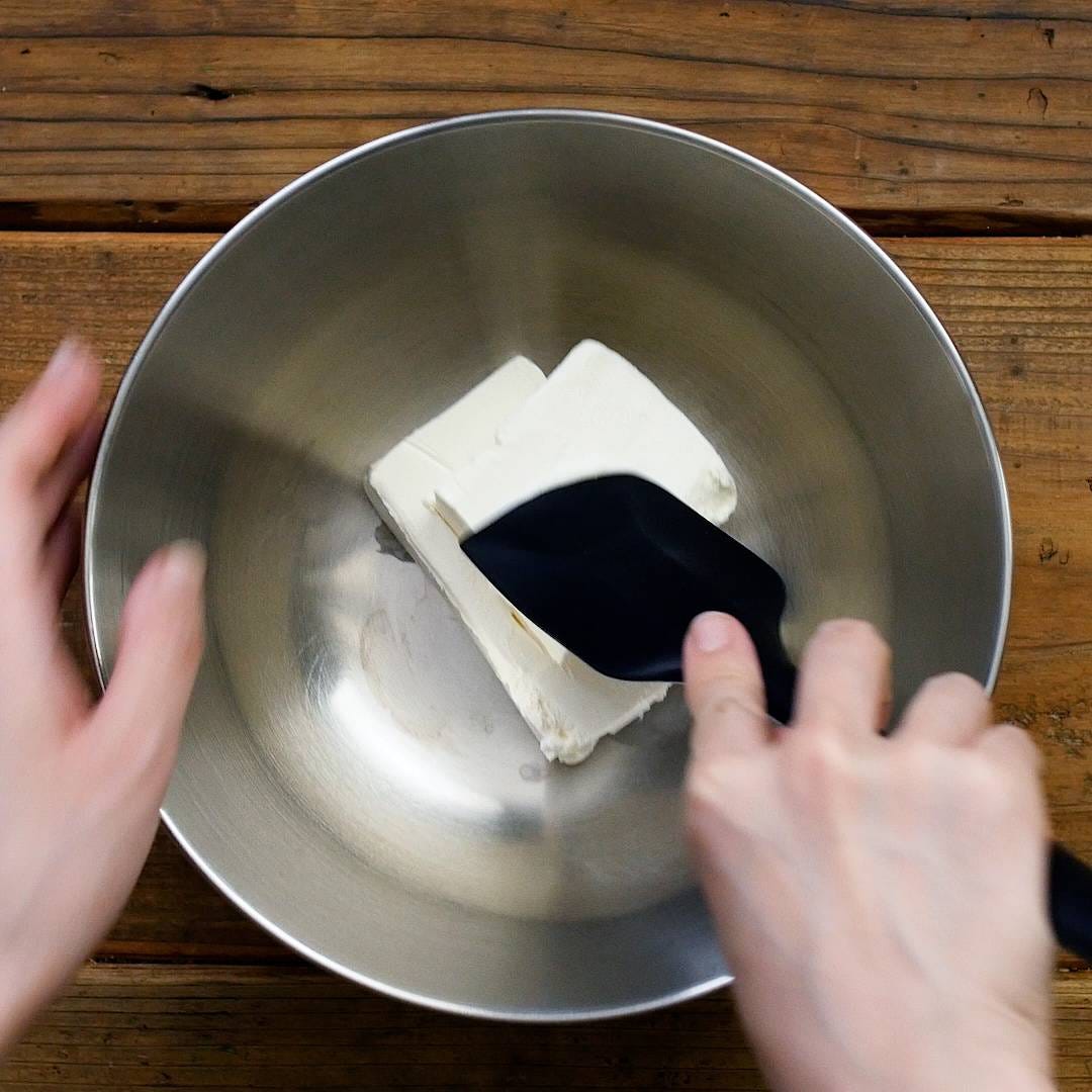 ボウルにクリームチーズを入れ、なめらかになるまでゴムベラで混ぜます。
