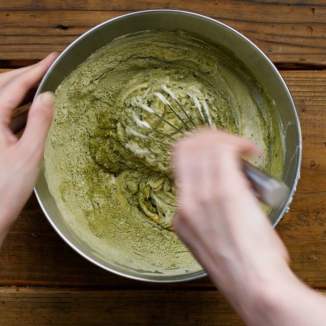 薄力粉、抹茶パウダーをふるい入れ、混ぜ合わせます。