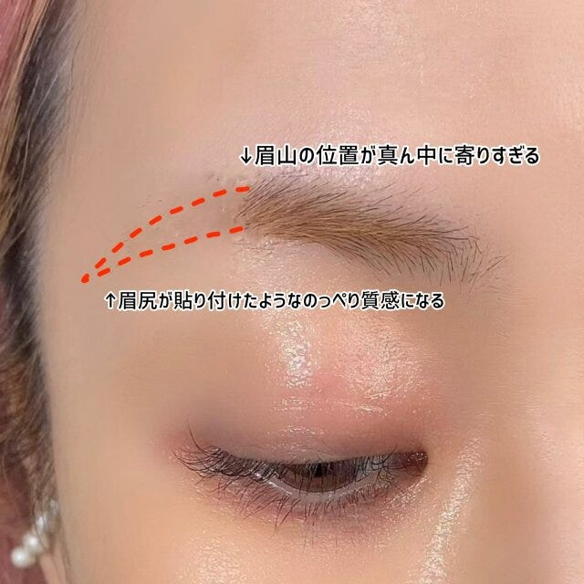 眉尻の形が上手く描けないから…と眉尻を丸々カットしている眉は、眉尻の質感がのっぺりしやすく、眉山の位置が真ん中に寄り過ぎて角度がおかしくなってしまいます。