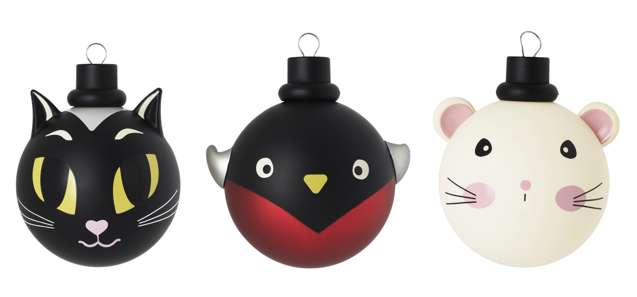 VINTERFINT/ヴィンテルフィント 2023「デコレーション ボールオーナメント」1,499円 ツリーに飾ると抜群の存在感を誇るやや大きめのオーナメント3個セット。冬にスウェーデンの田舎で見かけるネコ、ウソ(鳥)、ネズミをモチーフにしているので、北欧風のデコレーションを目指す人はぜひ!