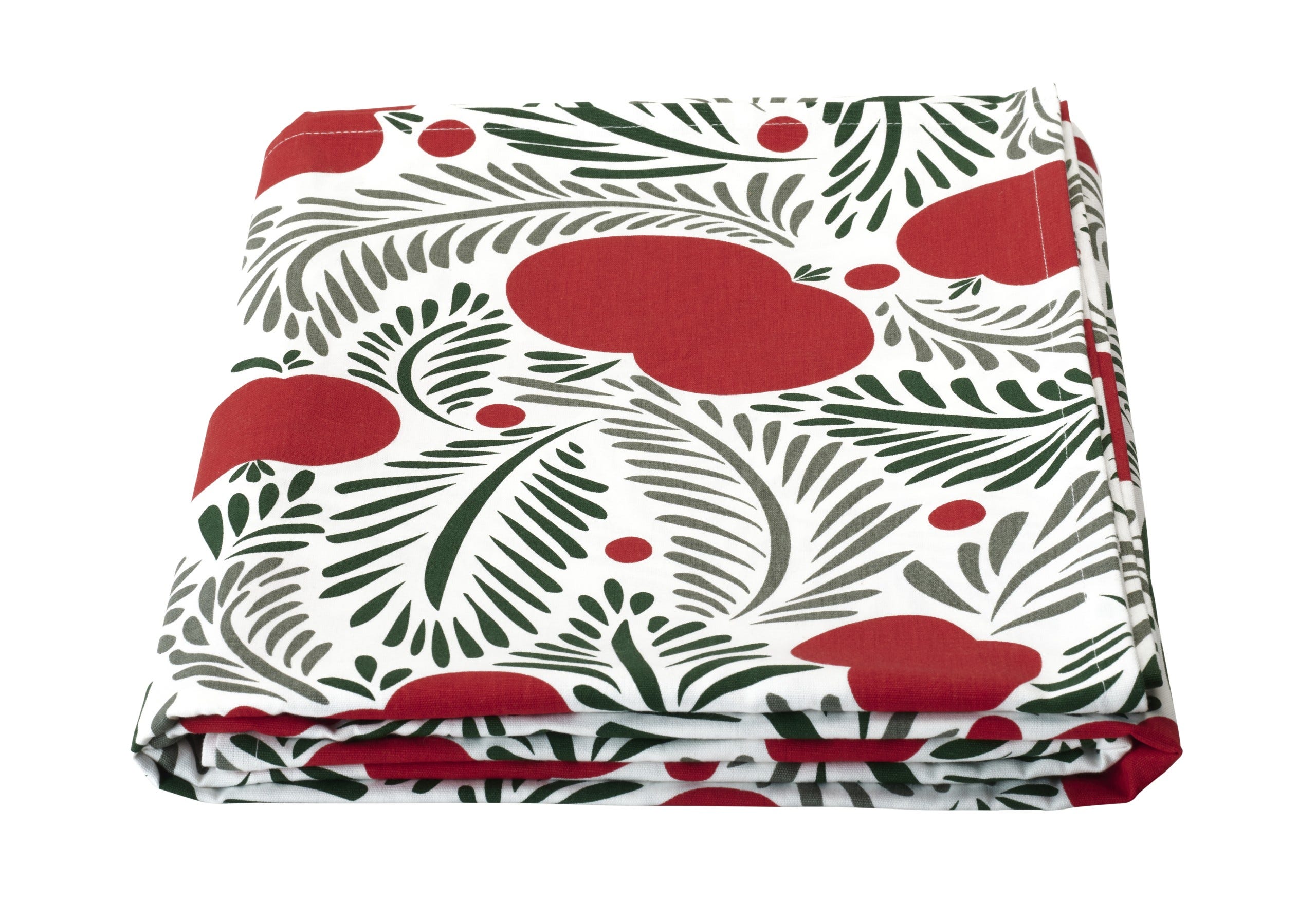 VINTERFINT/ヴィンテルフィント 2023「テーブルクロス」2,999円 赤いリンゴに緑のトウヒの枝、小さなベリーをあしらったテーブルクロスが、クリスマスのテーブルを華やかに演出。綿100%のため、汚れても洗濯機で洗える点も高ポイント。