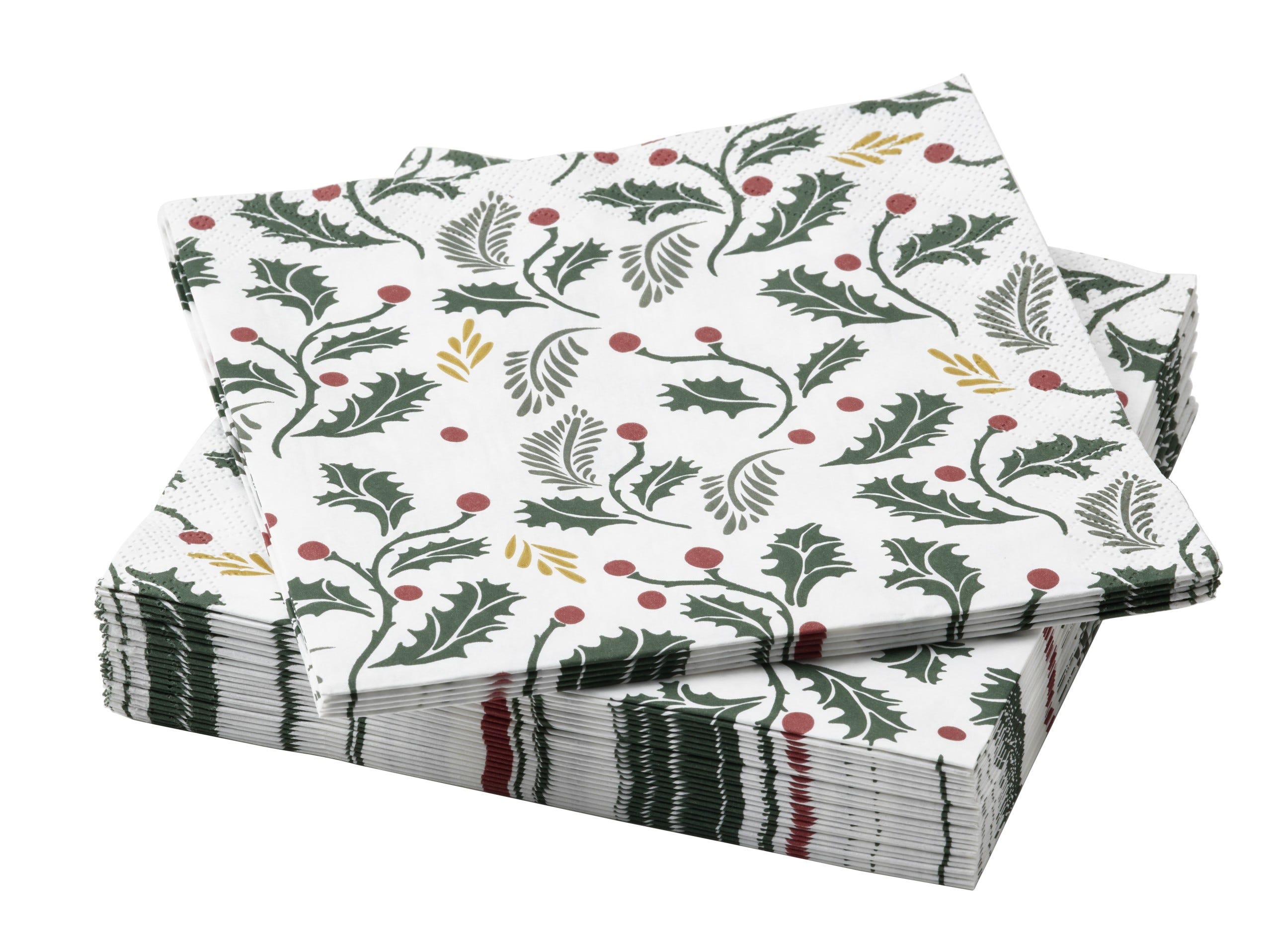 VINTERFINT/ヴィンテルフィント 2023「紙ナプキン」299円 「イケア」の人気アイテム「紙ナプキン」にも、クリスマス限定パターンが登場。ヒイラギの葉が散りばめられたデザインは、大人っぽいテーブルコーディネートにもマッチしそう。