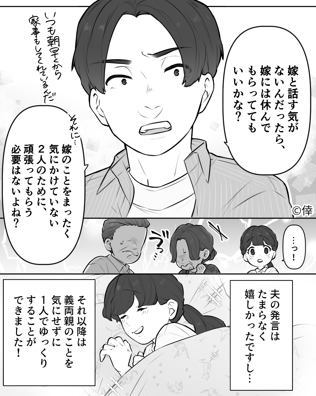 - ?<夫に感謝…>嫁を“空気扱い”する義両親…。嫁は愛想笑いを続けるが→『あのさあ』辛すぎる状況を打開した“感激の一言”に感謝!