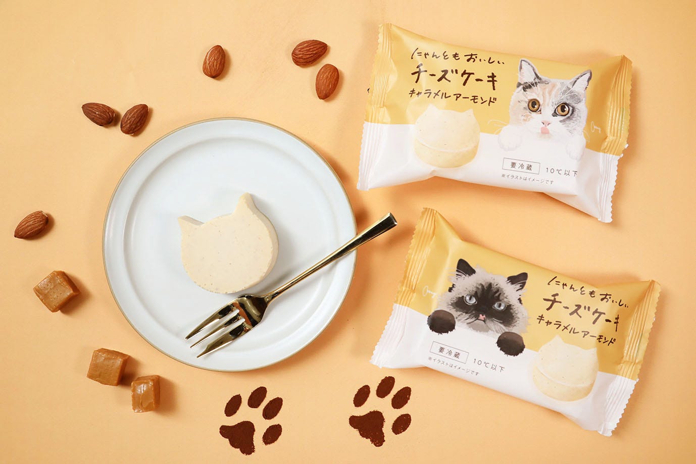 『にゃんともおいしいチーズケーキ キャラメルアーモンド』は、キャラメルとアーモンドの2つの香ばしい味わいとクリームチーズの酸味とコクが口いっぱいに広がるねこ型チーズケーキで、キャラメル風味のチーズケーキにアーモンドペーストを混ぜ込み、なめらかな口溶けに仕上げている。キャラメルとアーモンドの香ばしい芳醇な香りが、温かい飲み物との相性抜群。