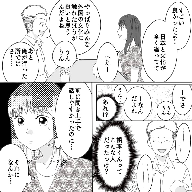 主人公には同じサークルで知り合った、橋本くんという好きな子がいます。彼は昨年から留学してしまい、離れ離れになっていました。