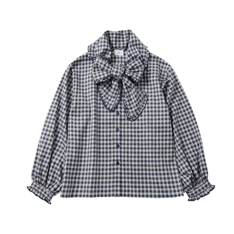 大胆な大ぶりリボンで顔の大きさをカムフラージュ。お上品レトロなチェックにきゅん♡ そでのフリルでガーリー度アップ。