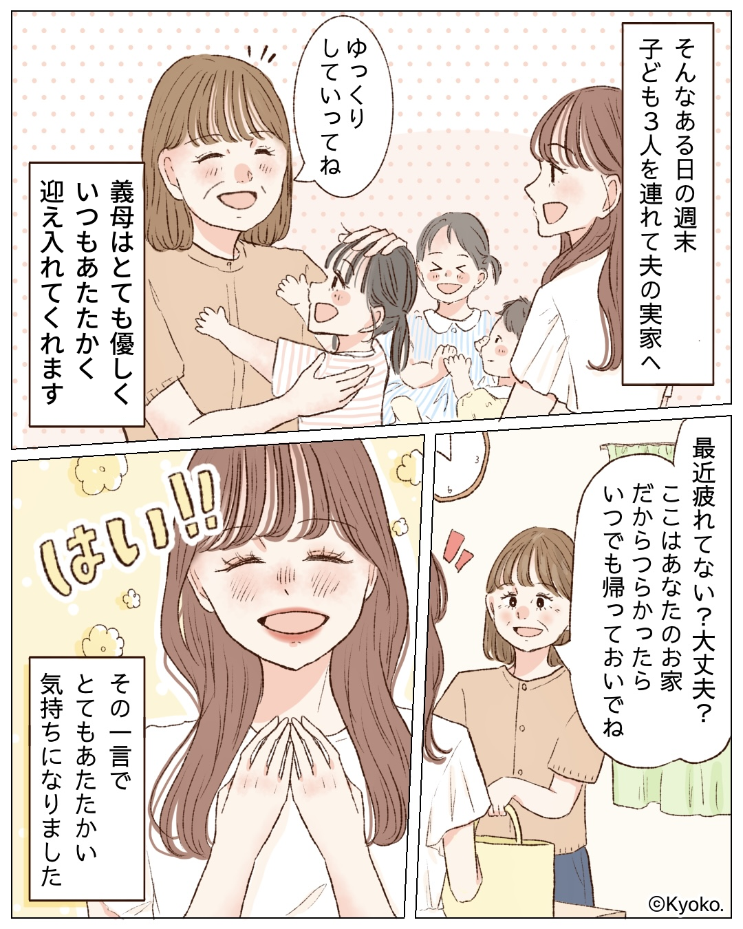 心が壊れかけていた主人公は、義母の優しい一言に救われたのでした。