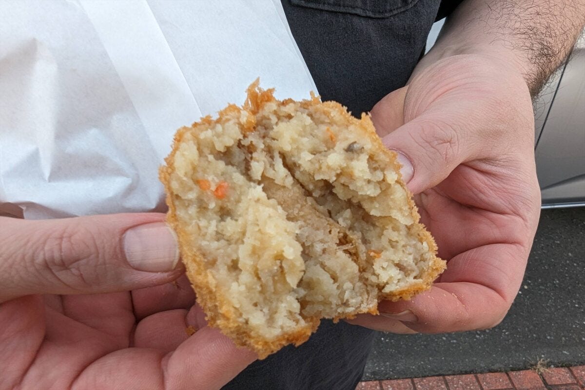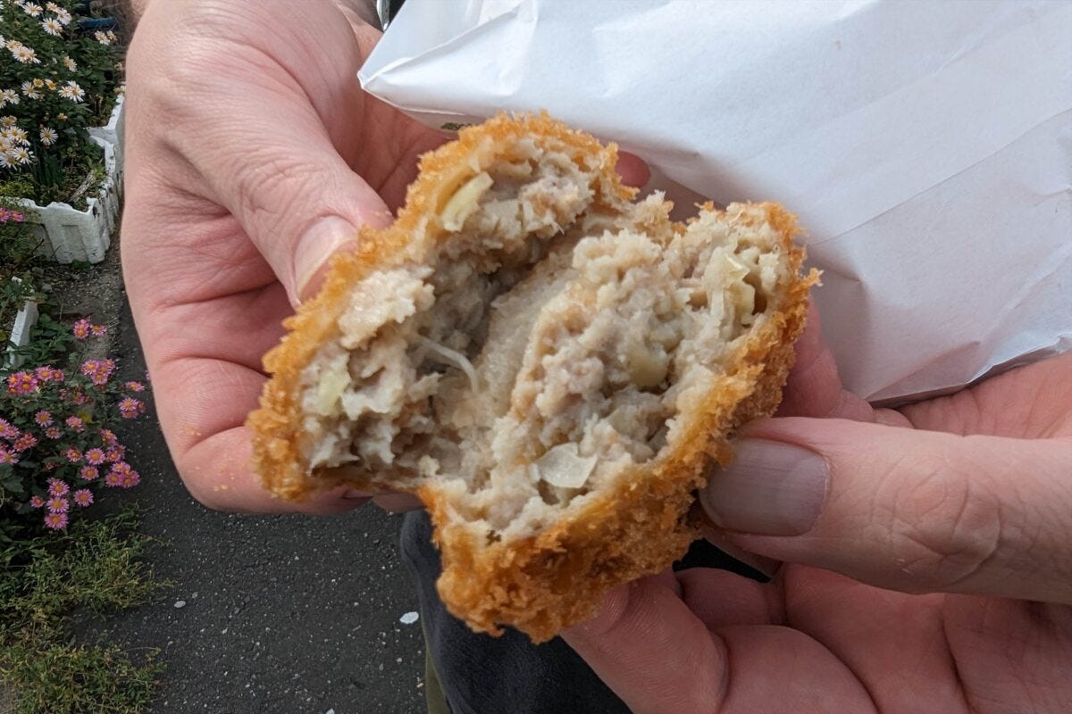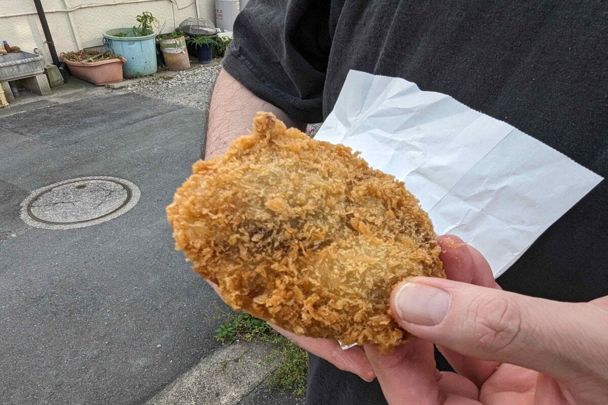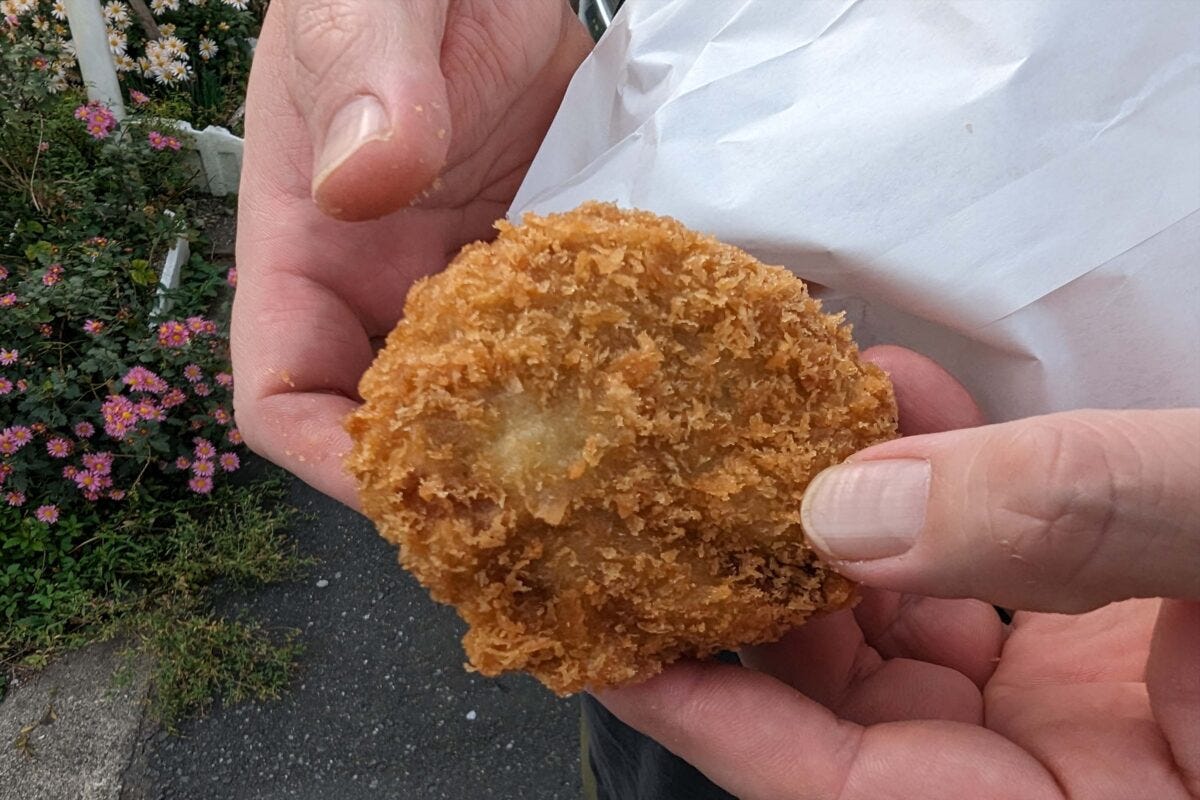 まずはコロッケを実食。安価なのに大判で奏さんもニッコリだが、肝心なのは味である。