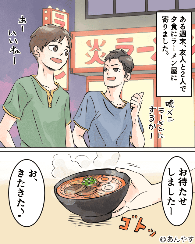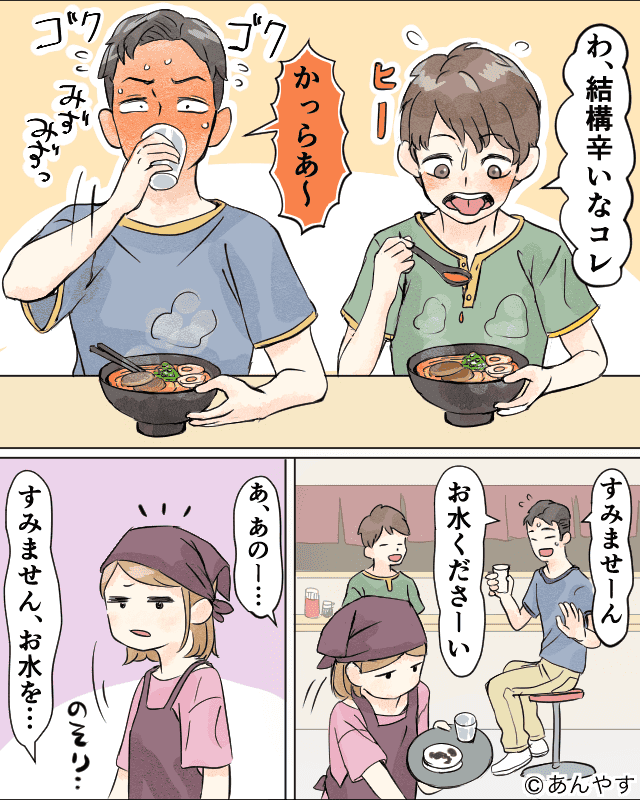 注文したラーメンが想像よりも辛く、店員にお水を頼んだ主人公。