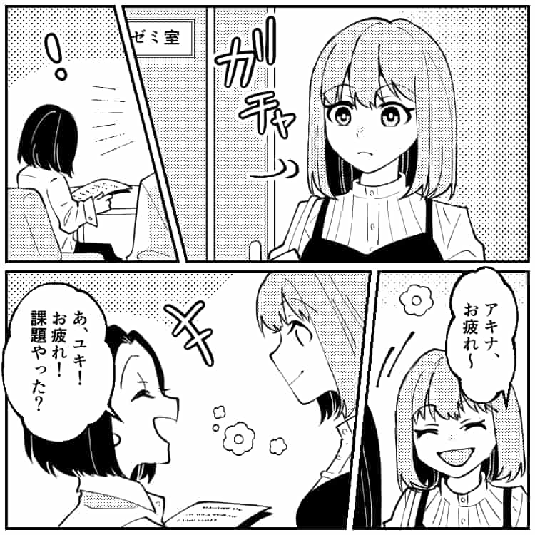 主人公は次の授業のため、ゼミ室に入ると友だちのアキナとハヤトがいました。
