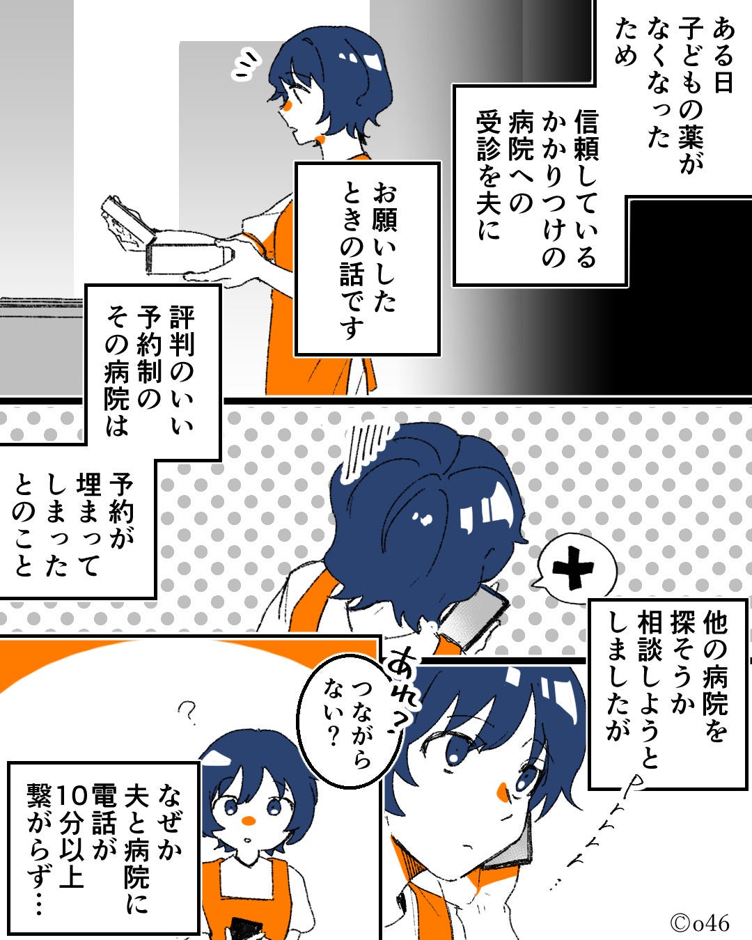 焦った主人公は、夫に電話を切らせ、病院に謝罪の連絡を入れました。