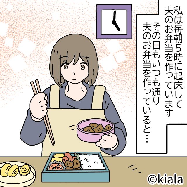朝早くに起きて、夫のためにお弁当を作っていた主人公ですが…。