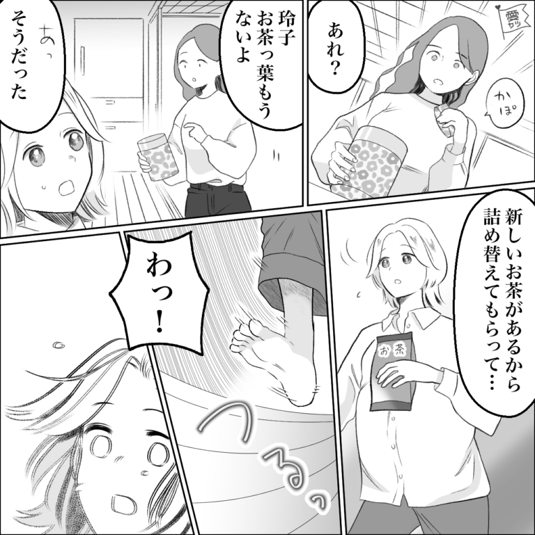 お茶の袋を持って行こうとした瞬間、主人公は足を滑らせて床にしりもちをついてしまいました。
