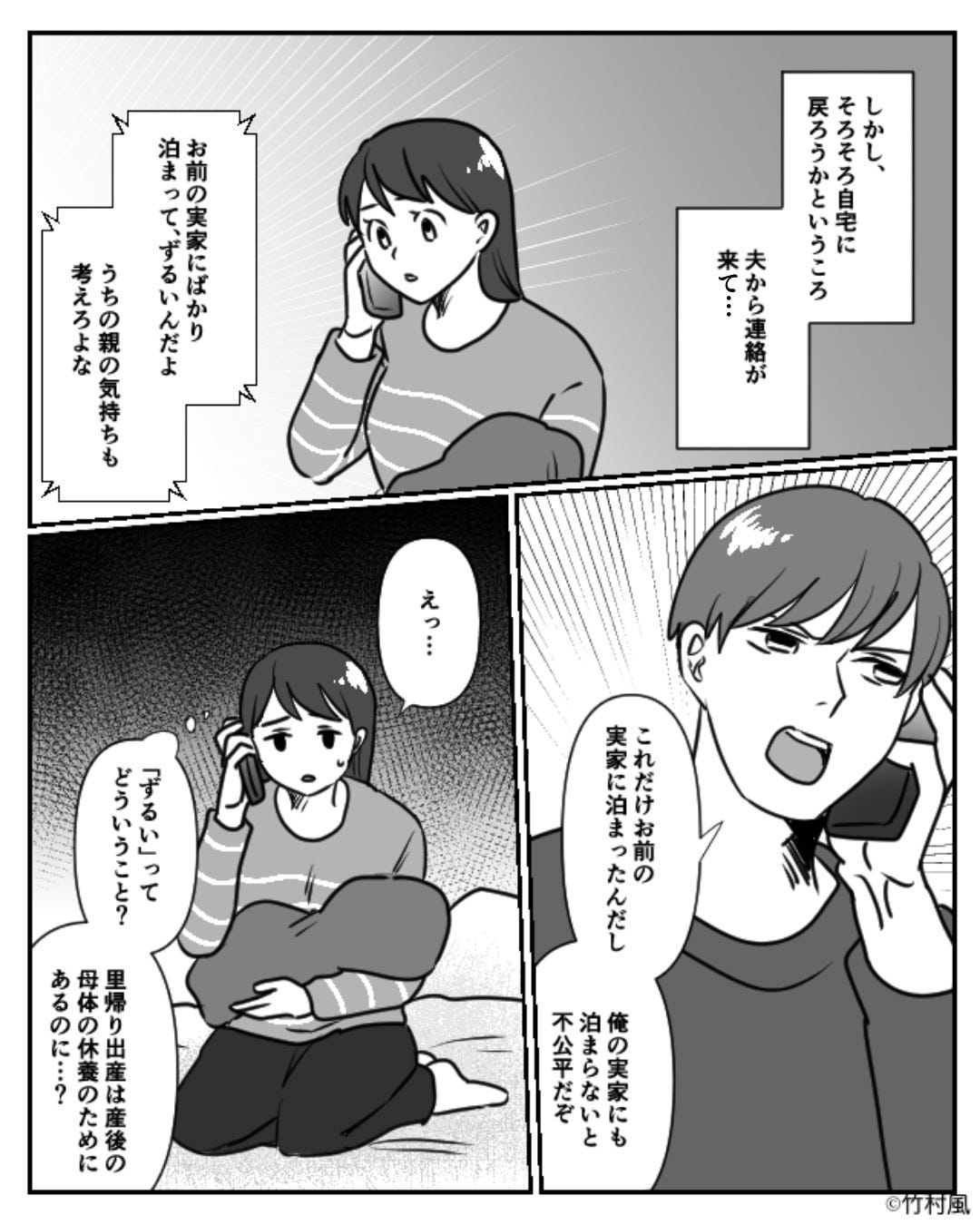 すると、夫から「お前の実家にばかり泊まってずるいんだよ、うちの親の気持ちも考えろよ」と連絡がきたのです。
