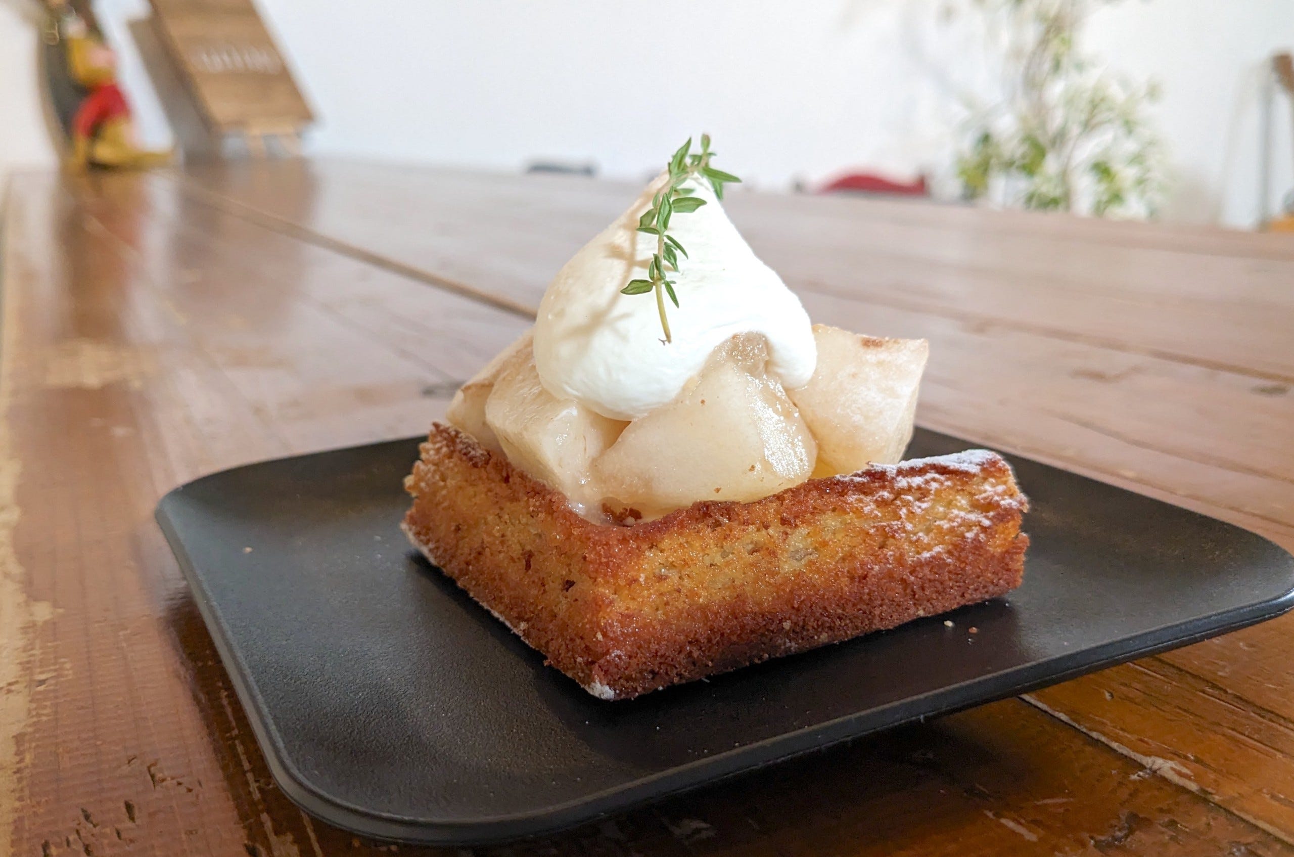 「洋ナシのタルト」テイクアウト770円 イチオシは、秋・冬にお目見えする「洋ナシのタルト」。新鮮な洋ナシに合わせるのは爽やかな酸味のサワークリームを使用したクリーム。そしてスクエアのタルト土台は、コクのあるカスタード入りのダマンド生地。この組み合わせが、味の一体感を生み出します。