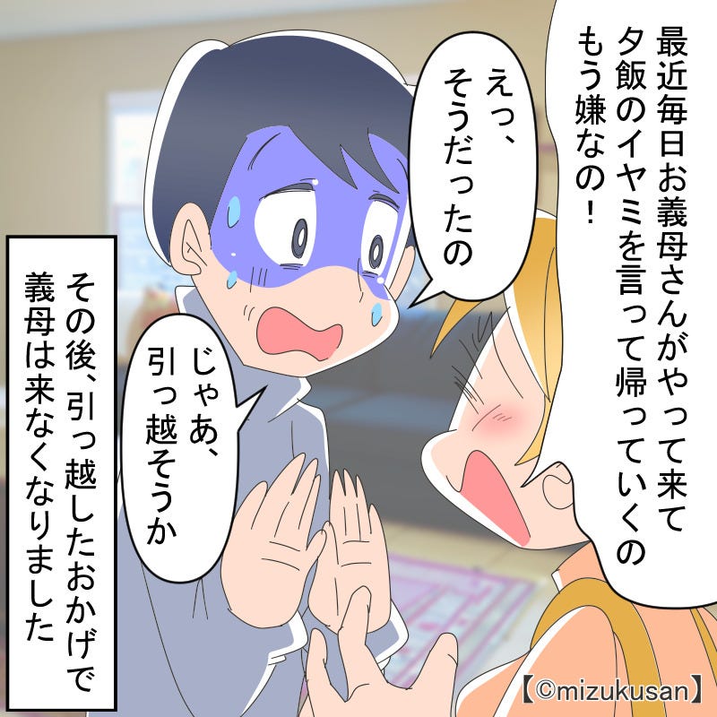 我慢できなくなった嫁は夫に相談し、引っ越すことになったようです。