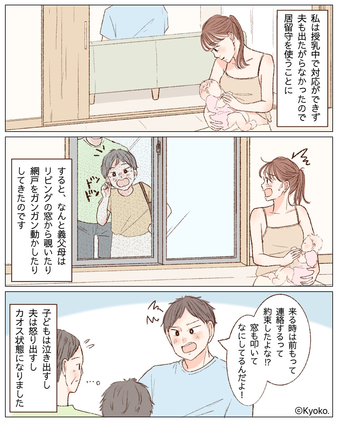 居留守を使っていると窓を叩くなど、義父母の非常識さに主人公は唖然とします。