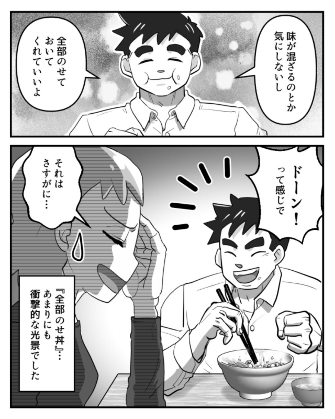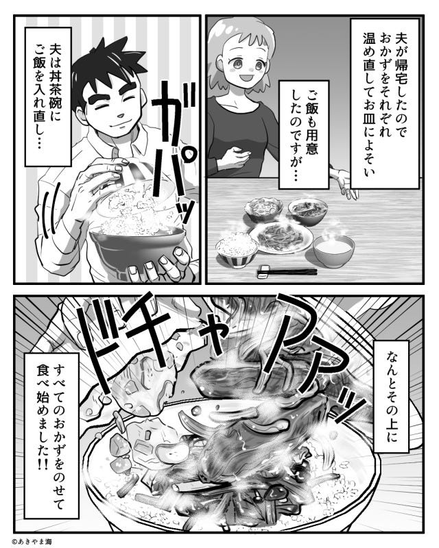 夫はすべてのおかずをご飯の上にのせるようです…。