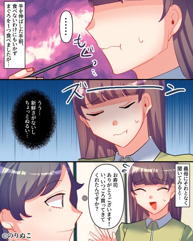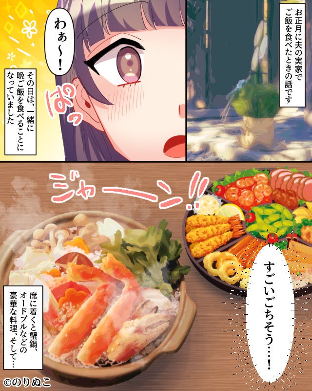 今回は、夫の実家で食事をするときに起こったエピソードを漫画で紹介します。