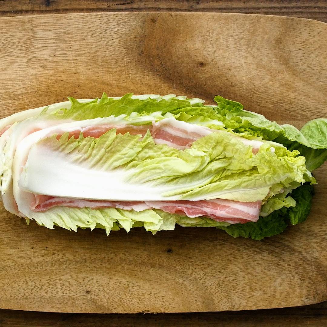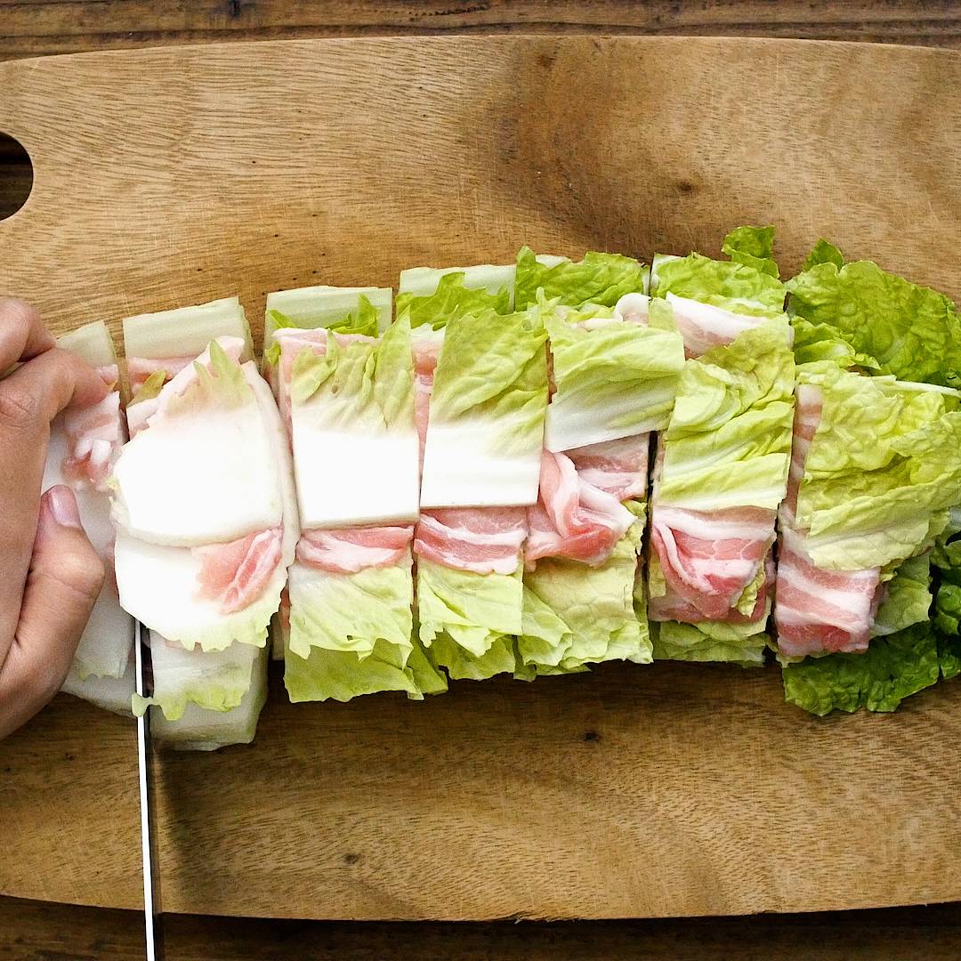 白菜、豚バラ肉を重ね、4cm幅に切ります。