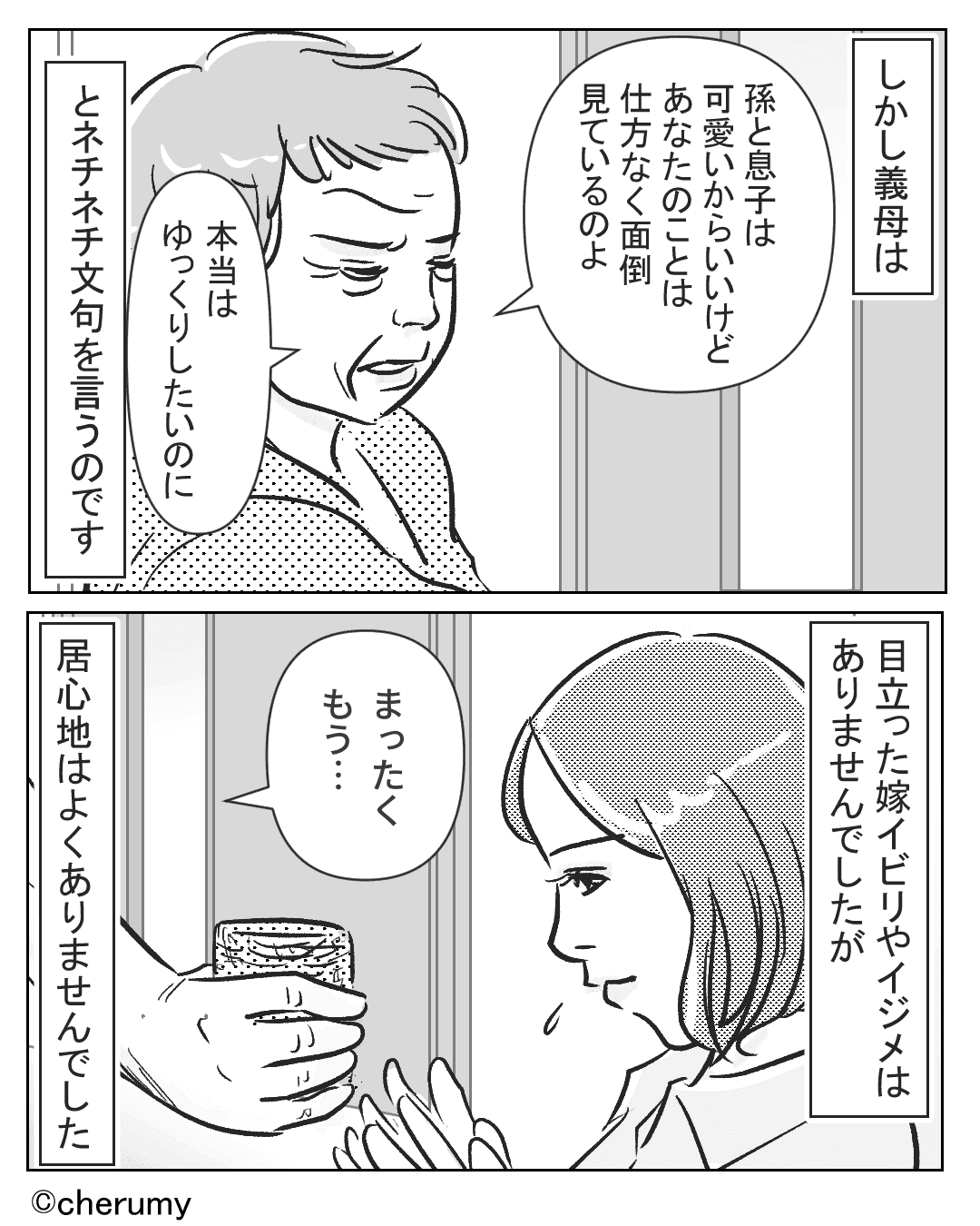 義母は「孫や息子は可愛いけど、あなたのことは仕方なく面倒見ているのよ」と主人公にネチネチ文句を言ってきます。