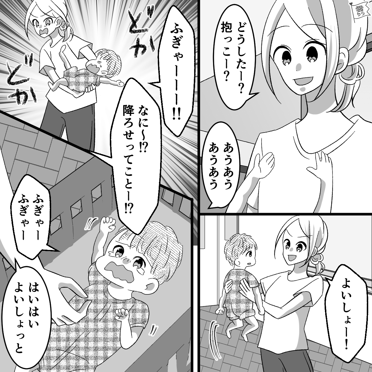 この日は子どもの機嫌が悪く、悪戦苦闘する主人公。